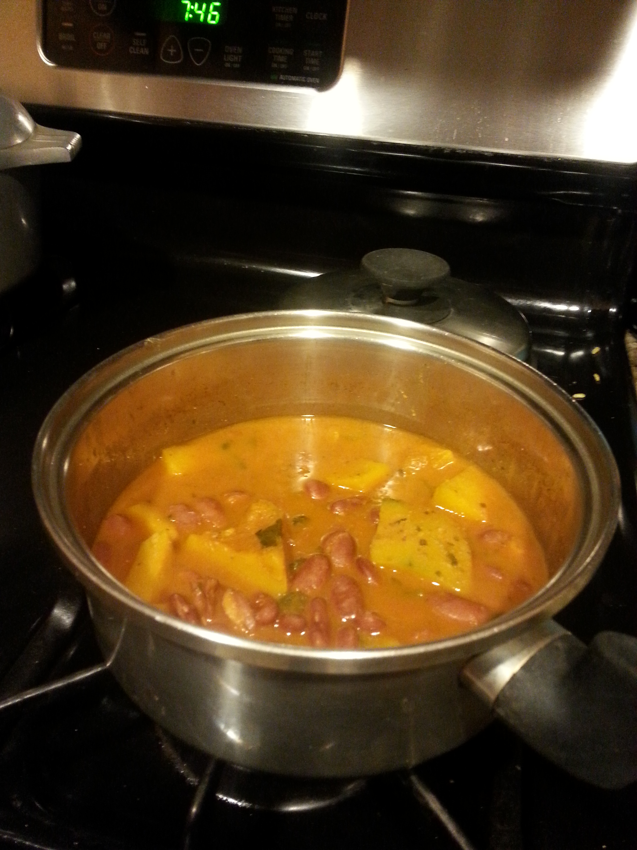Begin with putting oil into a 2 to 3-quart pot. Add sofrito and tomato sauce. Mix and simmer in a low flame. Add beans, water, and calabaza. Mix again. Increase flame to moderate-high flame and cover pot. When it comes to a boil, add cilantro, mix and reduce the flame to medium-low and simmer. Pot should remain covered. Let it cook for another 15 minutes, until calabaza is cooked tenderly.